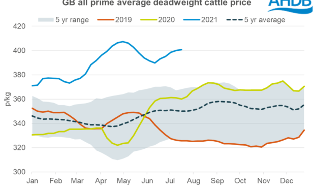 Prime cattle prices continued to climb in the week ending 17 July. The GB all prime average stayed strong at 400.8p/kg, with price increases recorded